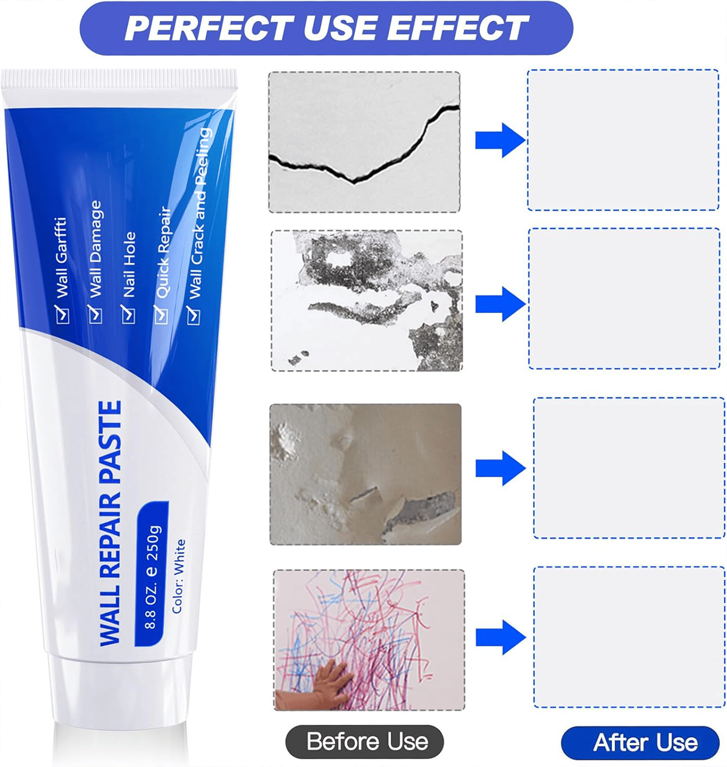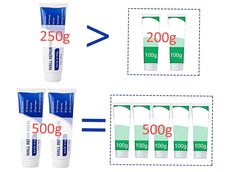 Each wall repair paste is 250g (8.8 oz), which can restore your various damaged walls, don't worry about the dose is not enough. And 250g drywall mending agent can be reused after opening, sealed and preserved plaster will not appear shrink, cracking and other phenomena. Large dosage drywall hole filler greatly saves your time and effort that spent on multiple choice.